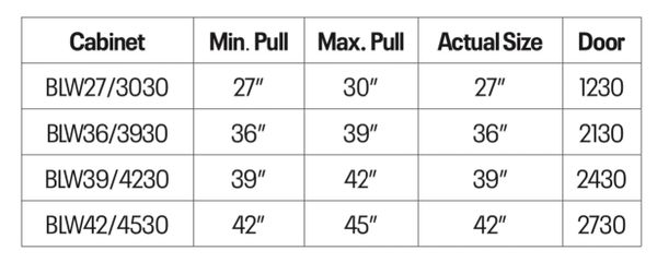 | Size | BLW27/3030 (1 door) – A, BLW27/3030 (1 door) – B, BLW27/3030 (1 door) – C, BLW36/3930 (1 door) – A, BLW36/3930 (1 door) – B, BLW36/3930 (1 door) – C, BLW39/4230 – A, BLW39/4230 – B, BLW39/4230 – C, BLW42/4530 – A, BLW42/4530 – B, BLW42/4530 – C |